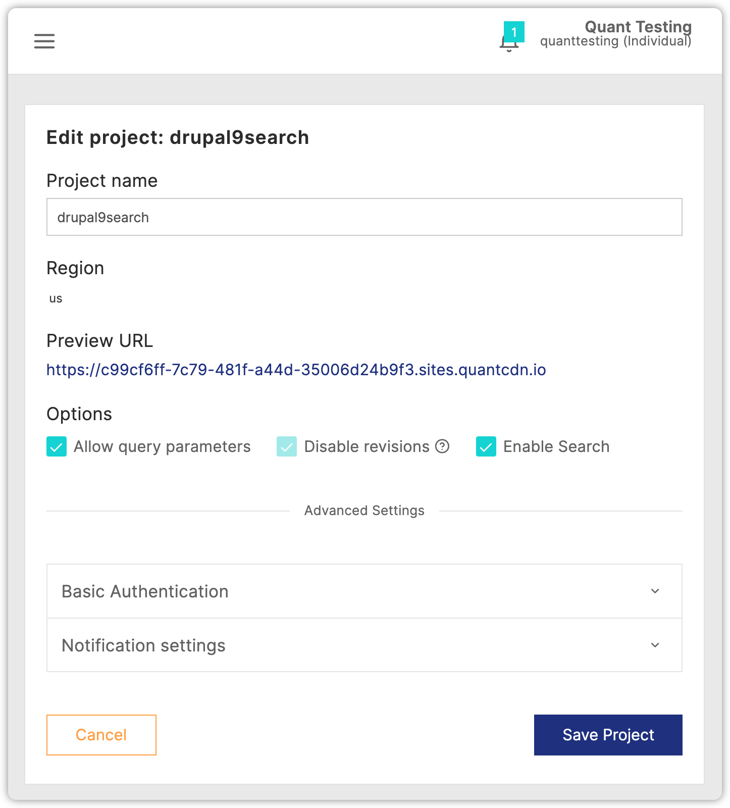 Note, your Quant project must have search enabled which is an add-on feature. You can enable search in the Dashboard by editing the project and clicking the Enable Search checkbox.